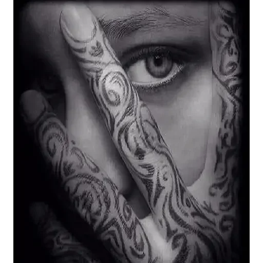 Uma mão com tatuagens cobre parcialmente um olho humano. A mão tem desenhos intricados e a unha é curta.