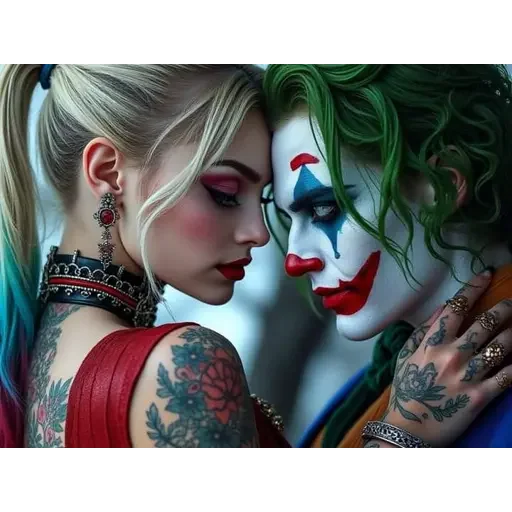 Um casal, aparentemente Harley Quinn e o Coringa, se beijando. Eles têm maquiagem colorida e suja, com respingos de…