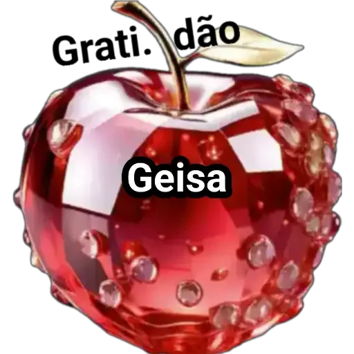 Uma maçã vermelha brilhante com gotículas de água, com o texto 'Grati. dão' na parte superior e 'Geisa' no centro.