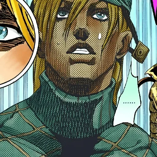 Personagem de anime com cabelo loiro e olhos azuis, vestindo um suéter verde, com uma expressão de surpresa ou choque, e uma lágrima no rosto.