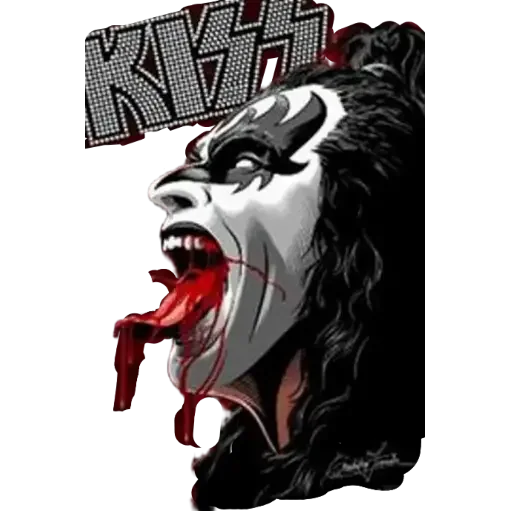 Rosto de um homem com a língua para fora e sangue, maquiagem branca e preta, e o logotipo KISS em cinza e vermelho.