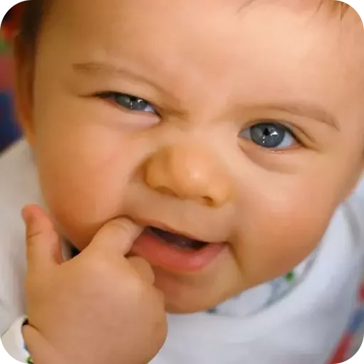 Um bebê com a mão na boca e uma expressão curiosa, olhando para o lado com um olho aberto e o outro semicerrado.