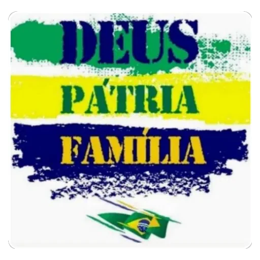 Uma figurinha com as palavras 'DEUS', 'PÁTRIA' e 'FAMÍLIA' em cores diferentes, com um fundo de tintas de cores verde, amarelo e azul. Abaixo das palavras, há uma bandeira do Brasil.
