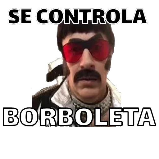 Um homem com óculos de sol vermelhos e bigode, com as frases 'SE CONTROLA' e 'BORBOLETA' em letras grandes.