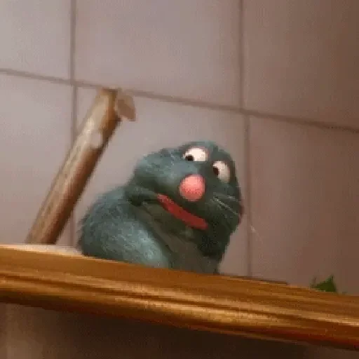 Um boneco de pelúcia verde com olhos grandes e nariz rosa, parecendo surpreso, em frente a uma parede de azulejos brancos.