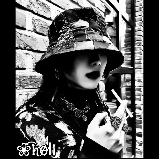 Uma jovem com um chapéu de aba larga e um cigarro na mão, em frente a uma parede de tijolos. A imagem é preto e branco e tem um estilo sombrio. O texto 'hell' aparece no canto inferior esquerdo.