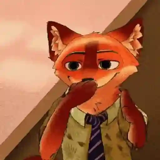 Raposa laranja com expressão pensativa, vestindo uma camisa bege e gravata listrada azul e roxa, com a mão no queixo.