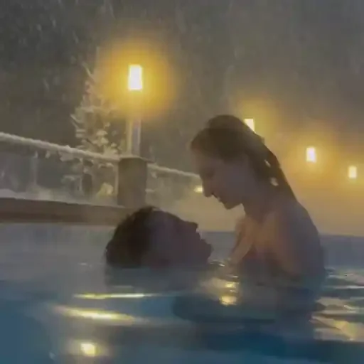 Mulher e homem em um jacuzzi à noite, com luzes quentes ao fundo. A mulher está com o cabelo preso e olha para o homem submerso.