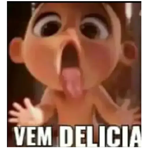 Um bebê de olhos arregalados com a língua para fora e as mãos levantadas, com o texto 'VEM DELICIA' embaixo.
