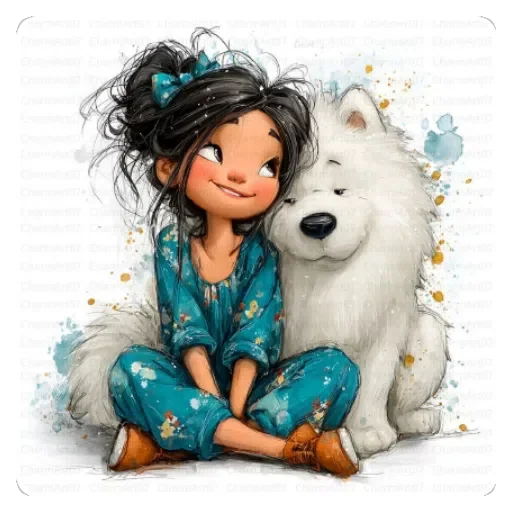 Menina com cabelo preto e um laço azul sentada ao lado de um cachorro branco, ambos com expressão feliz. A menina veste uma roupa azul floral e tem os olhos fechados.