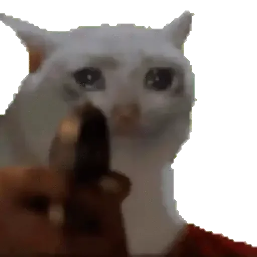 Gato branco com expressão surpresa ou confusa, apontando para algo com o dedo indicador.
