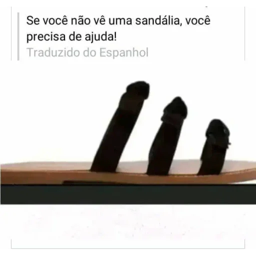 Três objetos pretos e alongados, possivelmente representando partes do corpo, dispostos em uma prancha de madeira. A imagem inclui o texto 'Se você não vê uma sandália, você precisa de ajuda!' e 'Traduzido do Espanhol'.