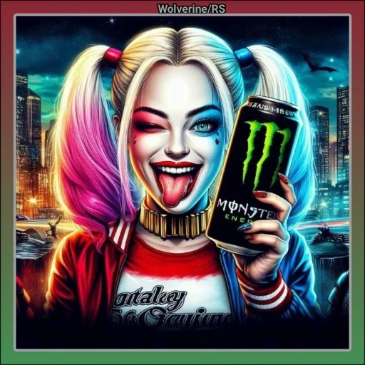 Harley Quinn com uma lata de Monster Energy, seu cabelo colorido em pigtails, maquiagem branca e vermelha, e um sorriso malicioso enquanto mostra a língua.