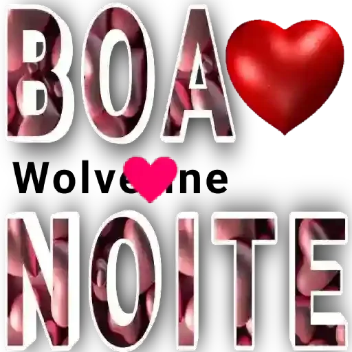 Uma figurinha com texto 'BOA NOITE' em letras grandes e corações, com o Wolverine no lugar do 'v' na palavra 'Wolverine'.
