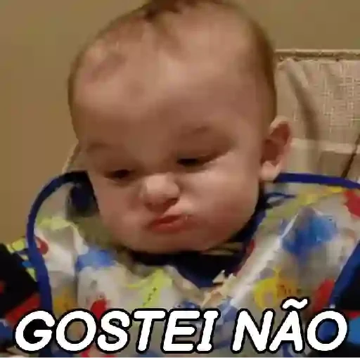 Um bebê com expressão de desinteresse ou desaprovação, usando um babador colorido. A imagem tem o texto 'GOSTEI NÃO' em letras brancas.