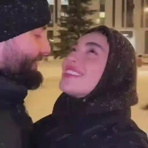 Um casal se olhando em um ambiente externo durante a neve. O homem usa um gorro preto e tem barba, enquanto a mulher usa um capuz preto e sorri.