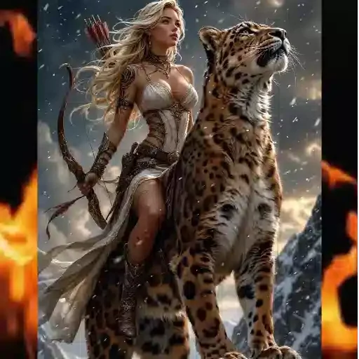 Uma mulher loira com um vestido prateado monta um leopardo em um cenário noturno com neve e fogueira ao fundo.