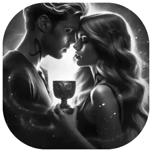 Um casal se beija com um cálice entre eles, em tons de cinza com iluminação dramática.