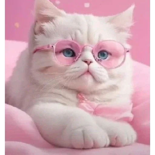 Gato branco com óculos de sol rosa e laço rosa no pescoço, deitado em uma superfície rosa.