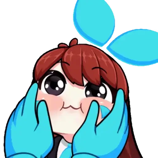 Garota de anime com mãos azuis na face, expressão surpresa ou feliz, cabelos castanhos e olhos grandes.
