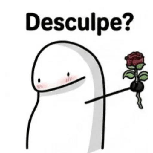 Um personagem de desenho simples e branco, com um rosto sorridente e corado, estende uma rosa vermelha com espinho enquanto diz 'Desculpe?'.