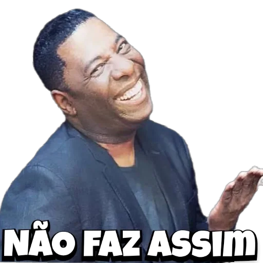 Um homem negro com cabelo curto e um sorriso, vestindo uma camisa azul, com o texto 'NÃO FAZ ASSIM' em letras brancas na parte inferior.