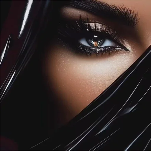 Olho de uma mulher com cabelo preto e maquiagem, olhando diretamente para o espectador com um olhar misterioso.