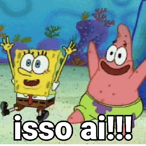 Personagens do desenho 'SpongeBob SquarePants', com texto 'isso ai!!!'. O personagem da esquerda é amarelo com olhos grandes e um sorriso largo, vestindo uma camisa branca e calça marrom. O personagem da direita é rosa com um sorriso largo e olhos grandes, vestindo uma sunga verde.