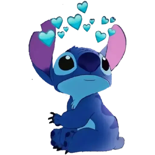 Stitch, o personagem azul de Lilo & Stitch, sentado com orelhas grandes e olhos grandes, com corações azuis flutuando acima de sua cabeça.