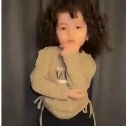 Menina com cabelo castanho encaracolado e expressão séria, vestindo blusa bege e calça preta.