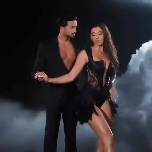 Um casal dançando, o homem de camisa aberta e calça preta, a mulher de vestido preto curto e sensual, em um cenário escuro com fumaça.