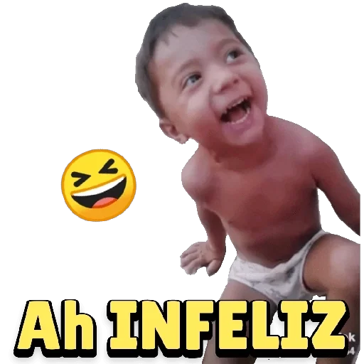 Menino bebê com expressão de surpresa ou choque, usando fralda, ao lado de um emoji de rosto sorridente com olhos fechados. Abaixo dele, a frase 'Ah INFELIZ' está escrita em letras amarelas.