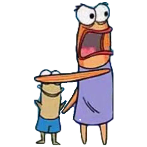 Um desenho animado de um adulto e uma criança, ambos com expressões engraçadas, o adulto com a boca aberta e a criança com um olhar surpreso, vestidos de forma simples.