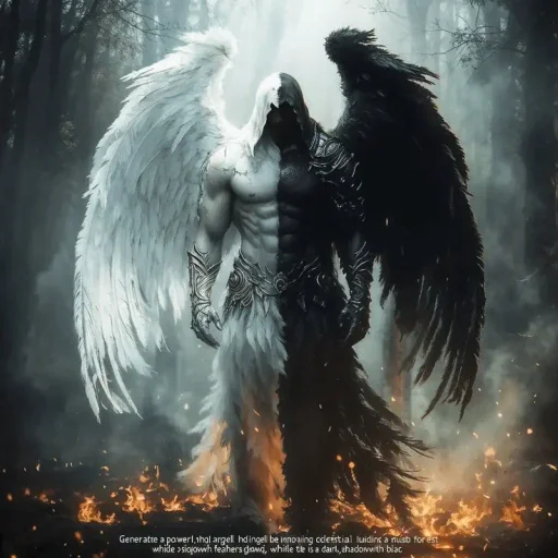 Um anjo com asas brancas e outro com asas pretas, representando o bem e o mal, em um fundo sombrio com chamas. O anjo branco à esquerda e o anjo negro à direita estão lado a lado.