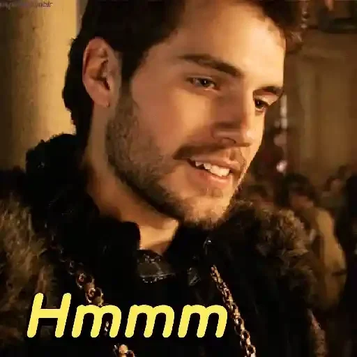 Um homem com barba e cabelo castanho, parecendo um personagem de série histórica, com um olhar pensativo e a palavra 'Hmmm' em amarelo na parte inferior.