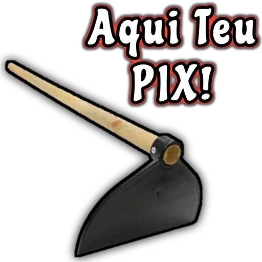 Uma pá com cabo de madeira e lâmina preta, com o texto 'Transferência Pix realizada com sucesso!' em preto, embaixo de…