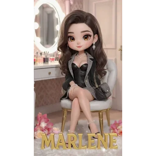 Uma boneca de anime sentada em uma cadeira, com o nome 'MARLENE' em letras douradas abaixo dela. Ela tem cabelo castanho longo e veste um blazer cinza com um top preto.