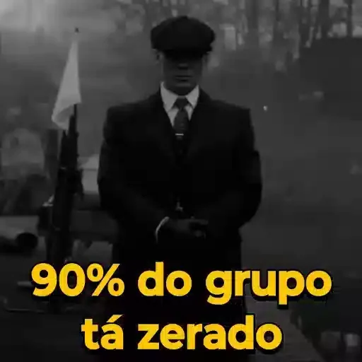 Um homem de terno e chapéu em preto e branco com a frase '90% do grupo tá zerado' em amarelo na parte inferior.