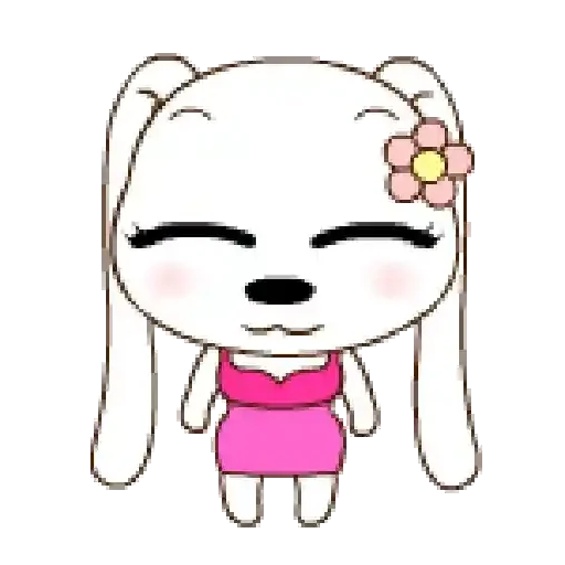 Um desenho de um coelho branco com um vestido rosa e uma flor rosa no cabelo, com os olhos fechados e bochechas rosadas.
