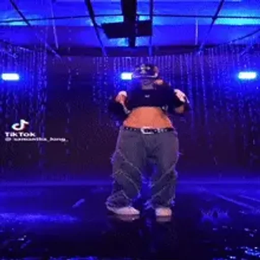 Uma pessoa dançando em uma sala com iluminação azul, usando um cinto largo e um boné, com o logotipo do TikTok ao lado.