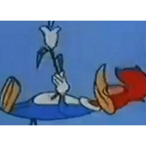 Personagem de desenho animado, pica-pau com cabelo vermelho e roupa azul, com expressão feliz e mão na parede.