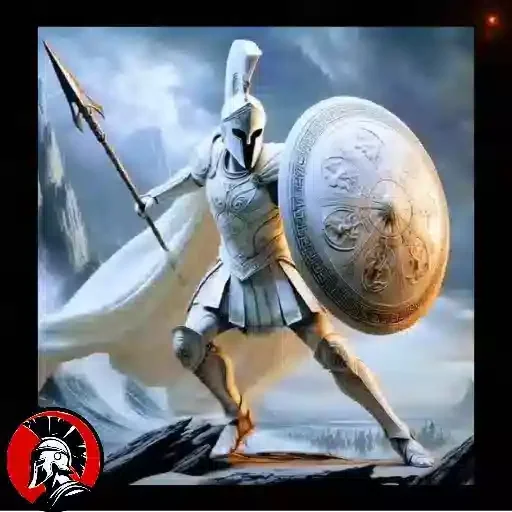 Um guerreiro antigo com armadura prata, capacete e capa, empunhando uma lança e um escudo grande com uma inscrição. O fundo é um céu nublado.