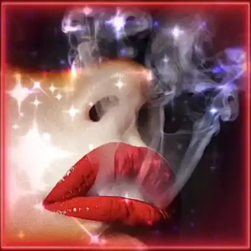 Rosto de mulher com lábios vermelhos e maquiagem, olhos fechados, com fumaça e estrelas ao redor.