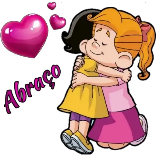 Duas meninas se abraçando com corações ao lado e a palavra 'Abraço'.