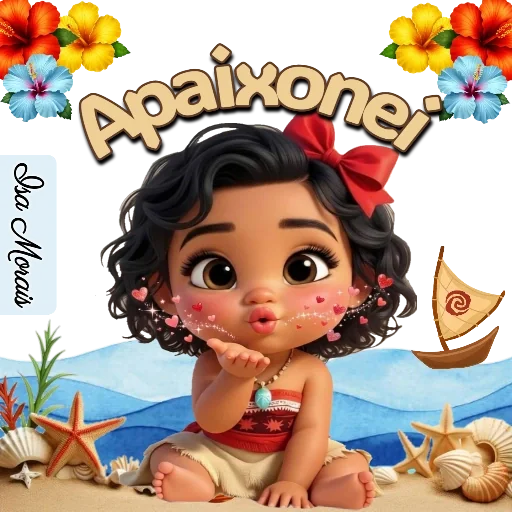 Uma menina com cabelo escuro e um laço vermelho no cabelo, sentada na praia com estrelas-do-mar e conchas, com a palavra 'Apaixonei' acima dela. Ela tem uma expressão fofa e coraçõezinhos no rosto.