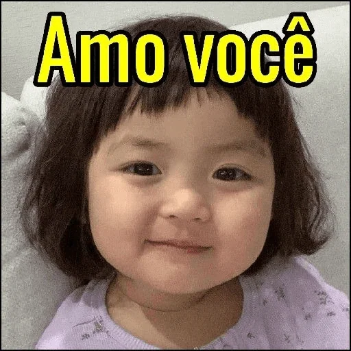 Menina com franja e cabelo castanho, com a frase 'Amo você' em amarelo.