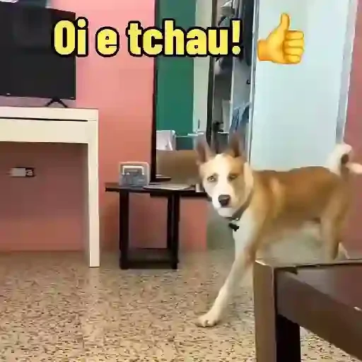 Um cachorro marrom e branco em uma sala com piso de granito, com a frase 'Oi e tchau!' em amarelo. O cachorro parece estar se aproximando.