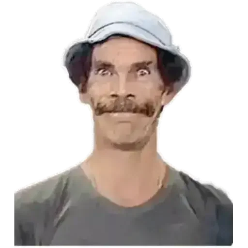 Um homem com um bigode grosso e um chapéu branco, vestindo uma camisa cinza.