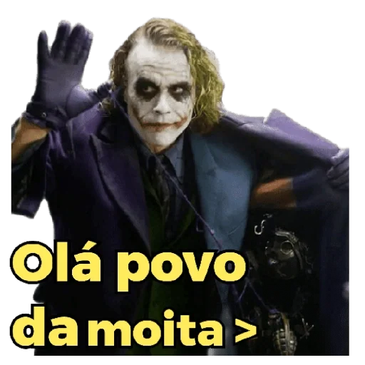 O Coringa, do filme Batman, sorri com um olhar sinistro e acena com a mão direita, enquanto diz 'Olá povo da moita >' em letras amarelas.
