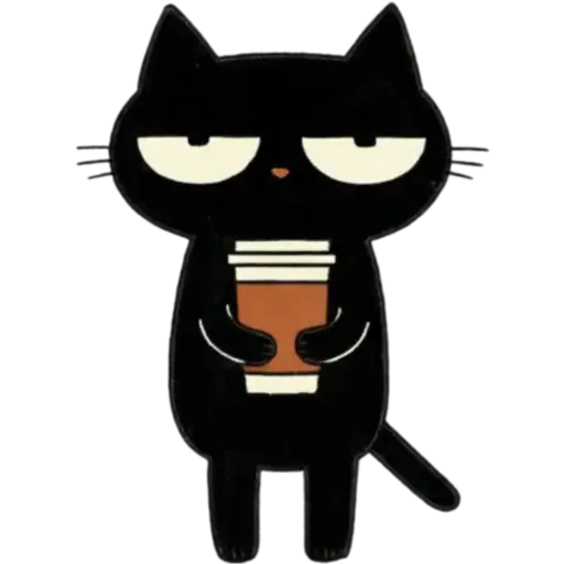Gato preto com olhos semicerrados segurando uma xícara de café.